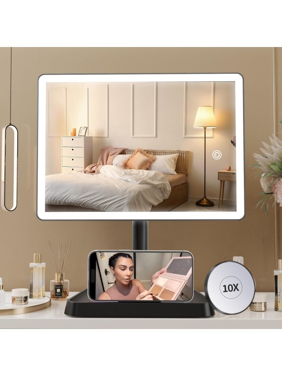Rechargeable Makeup Vanity Mirror with Lights, Large Lighted Desk Makeup Mirror with 96 LED Lights and 10x magnifying Mirror, 3 Color Lighting, Make up Light Mirror with Phone Holder