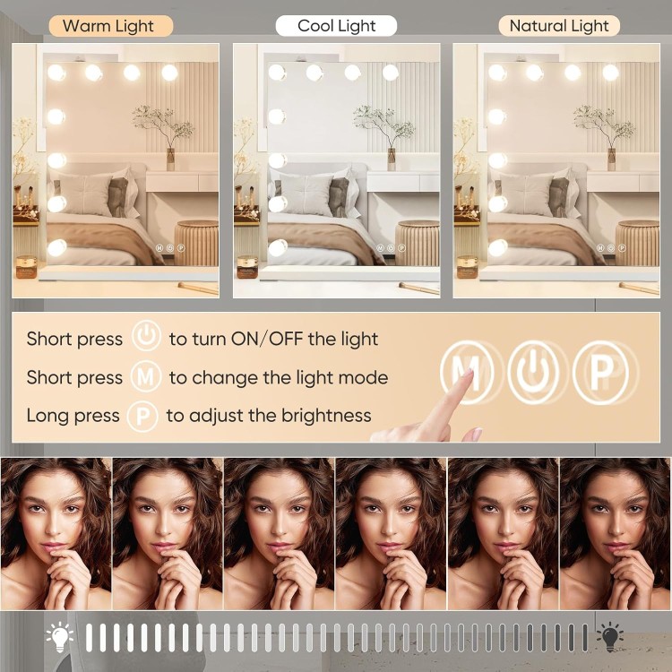 - 【Vanity Mirror with Lights】: Experience flawless makeup application with our hollywood vanity mirror. Featuring 15 high-quality LED bulbs, this lighted vanity mirror offers 3-color options and stepless dimming, mimicking natural light for gentle and eye-friendly illumination. Smart vanity mirror with touch design, easily short touch to turn ON/OFF the light or change light color, long touch to stepless adjust brightness, ensuring a perfect makeup looking every time